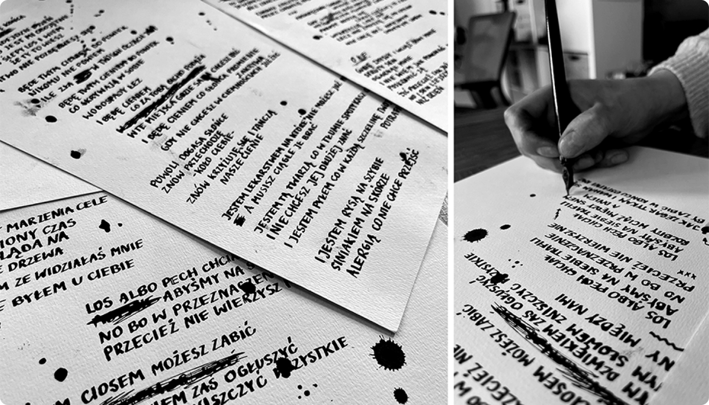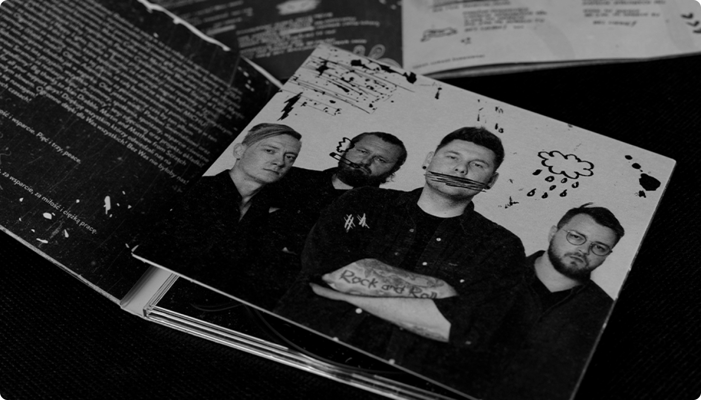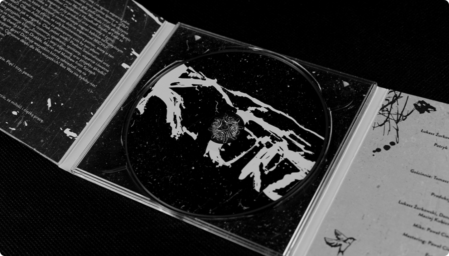 Do spółki z fotografem Adamem Szramką i naszym, wyspecjalizowanym w tematach muzycznych, Evoblack, stworzyliśmy projekt idealnie z nimi współgrający. Czarno-biała kolorystyka, odręcznie pisane treści we wkładce i przybrudzone, wydrapane tekstury, które zastosowaliśmy, okazały się bezbłędnym wyborem.
